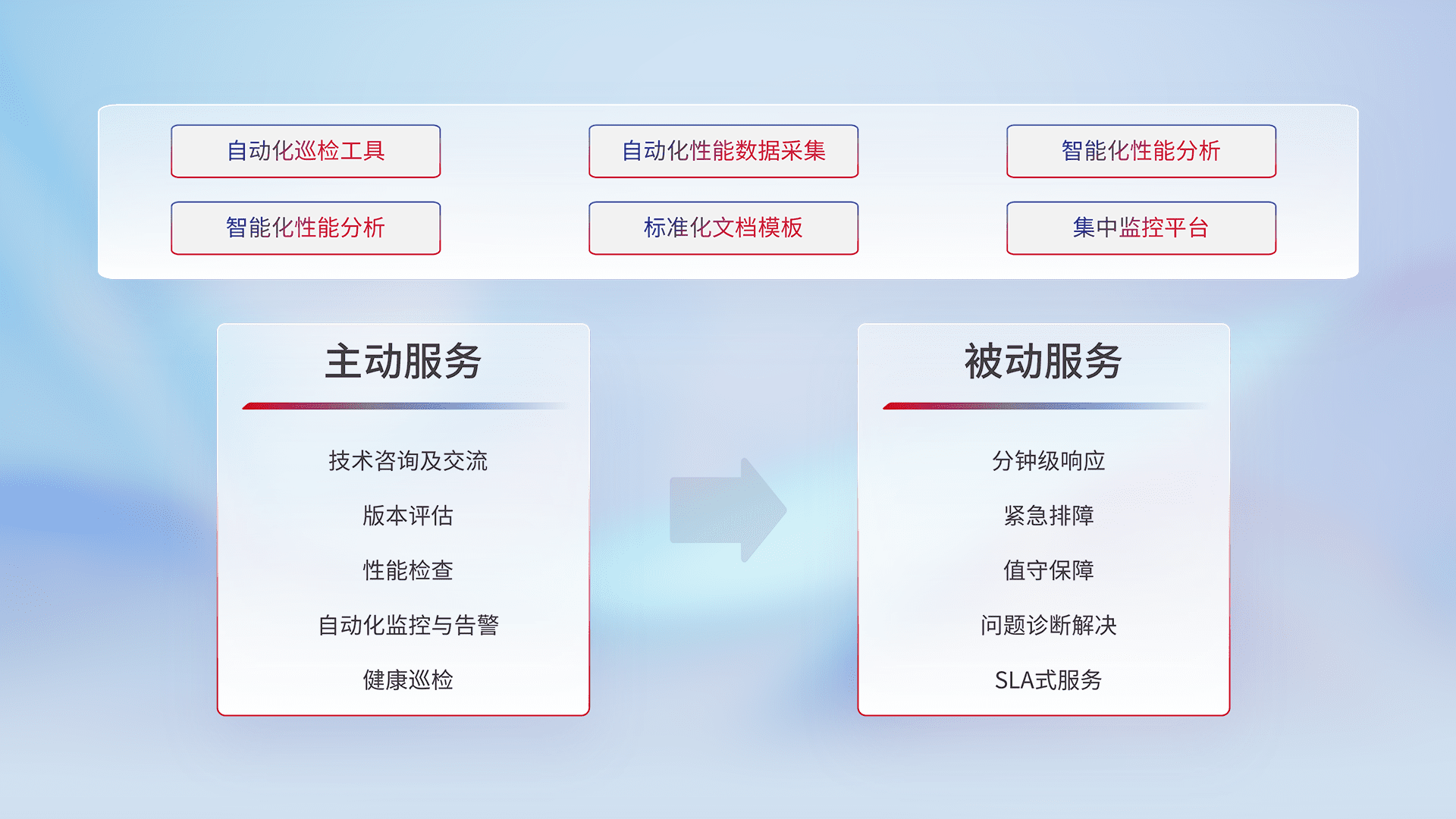 智能化工具和标准化文档,,保障服务质量,,,,提供主动服务(包含技术咨询、、、版本评估、、性能检查、、、、自动化监控与告警、、、、健康巡检)和被动服务包含(分钟级响应、、、、紧急排障、、值守保障、、、、问题诊断解决、、、、SLA服务)。。。。
